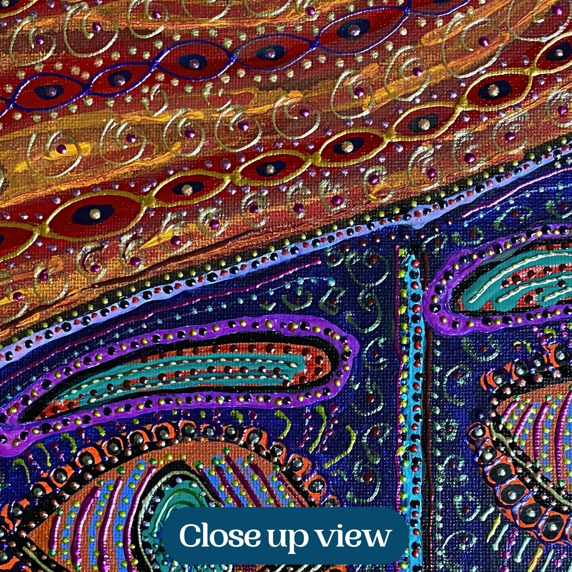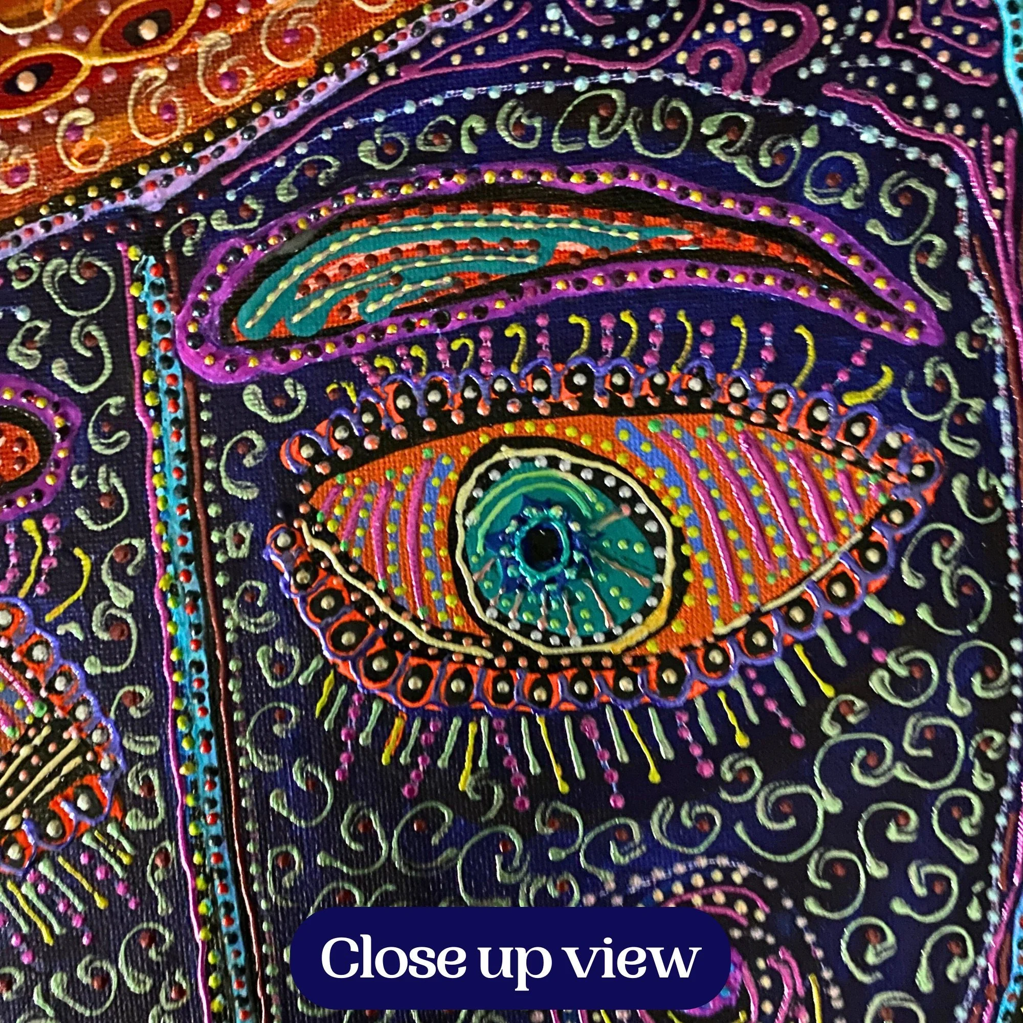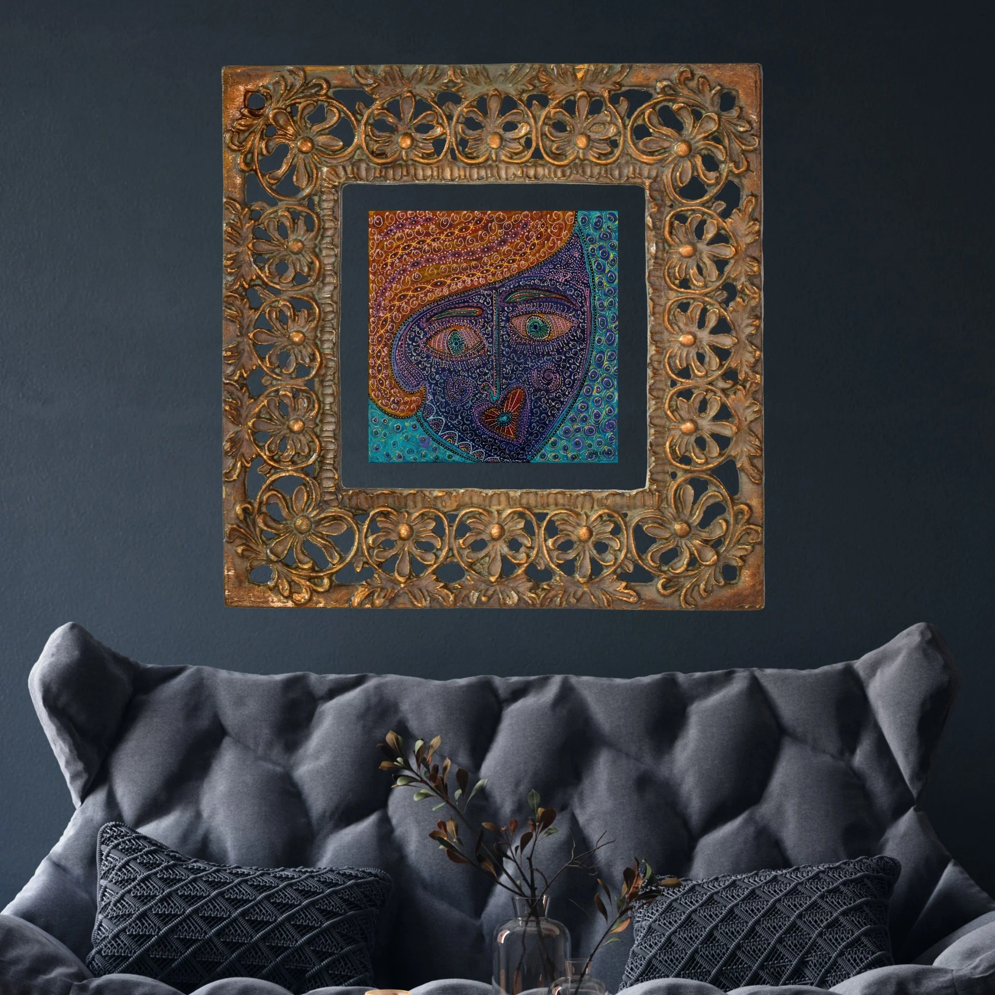 Painting measures 14" length x 14” width, 1/2" depth. Ready to hang, wire hardware attached to back.