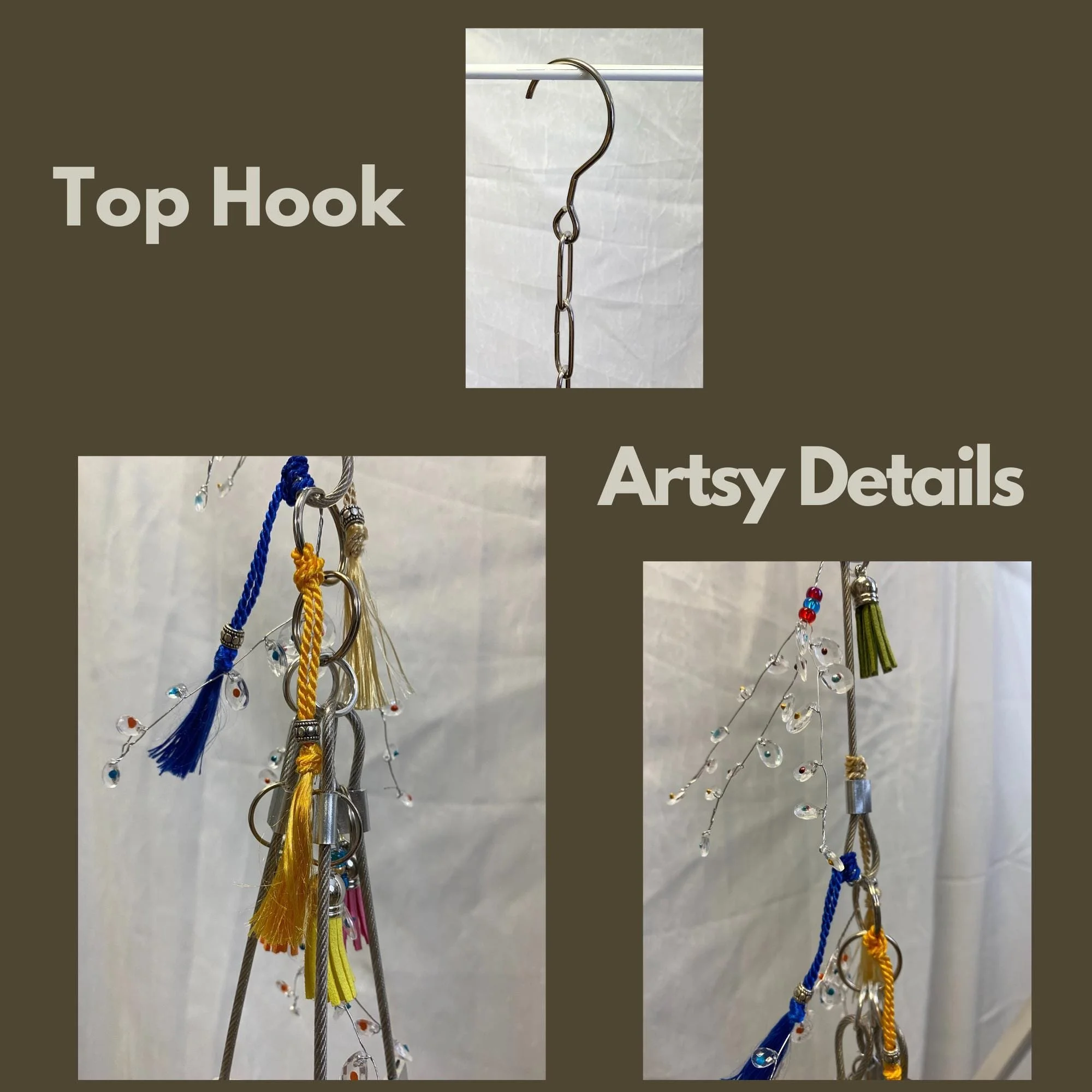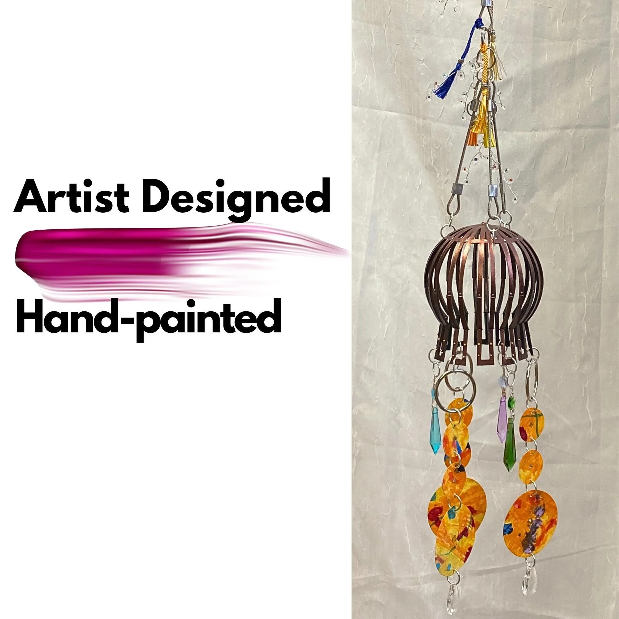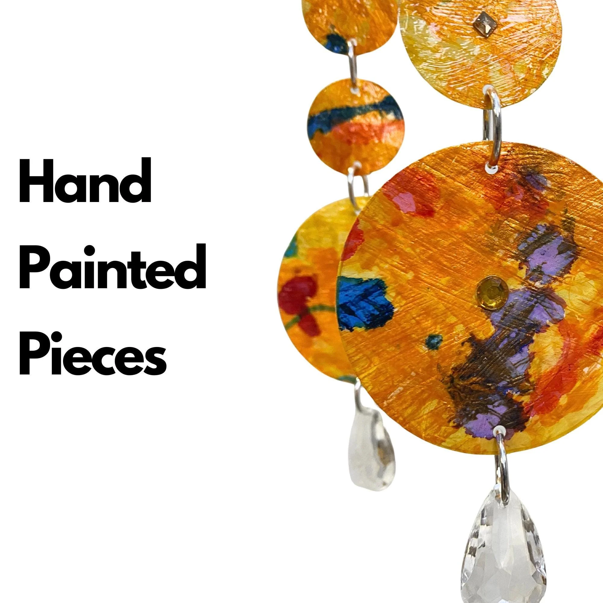 Designed to hang from your ceiling - indoors only. Each circular piece has been hand painted on rice paper using mixed media. A high gloss finish accents the dynamics of the multiple colors used in each design. Crystal adornments and tassels add a bit of glamour and elegance!