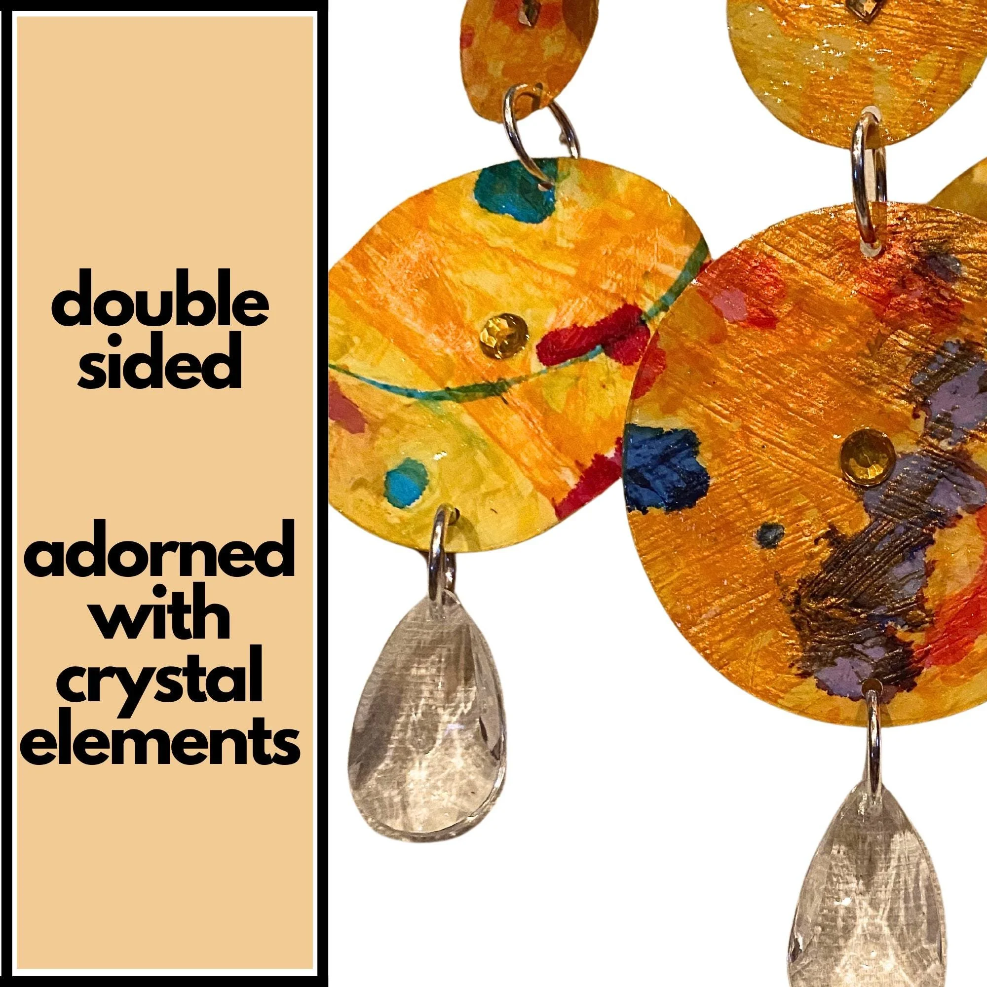 Colorful, abstract art, hand painted designs - 9 circular art pieces and colorful crystal elements are suspended from this unique Mobile Gallery.