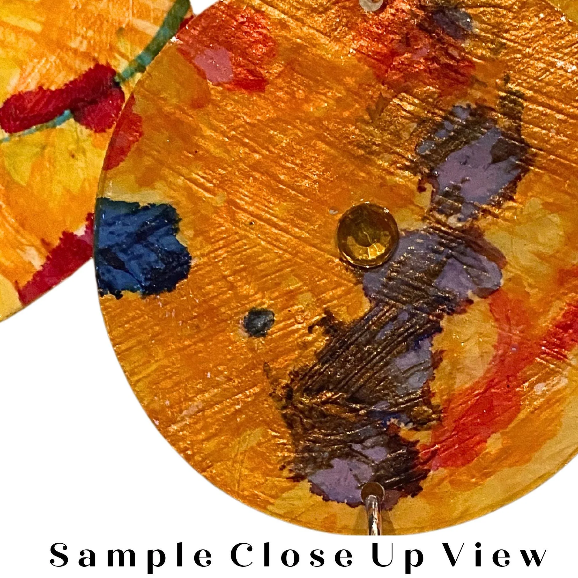 Large Painted circular pieces measure: 3" length x 3" width, smaller painted circular pieces