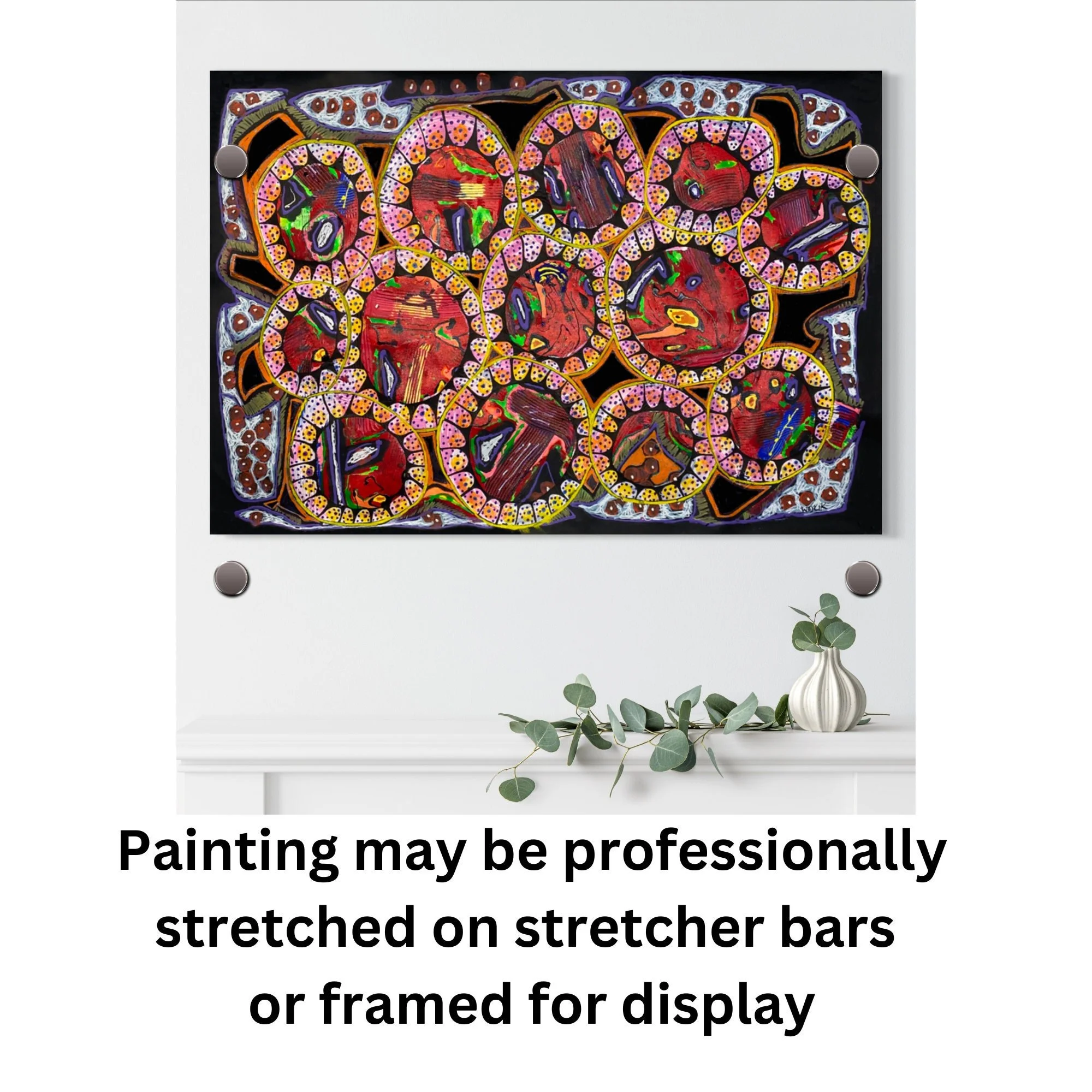 Painting may be framed or professionally applied to stretcher bars (frame shop), edges are painted to wrap around sides of stretcher bars.